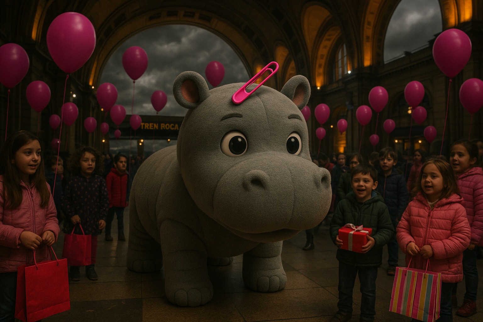 Los chicos llevan los pequeños hipopótamos magenta en las manos, que luego enganchan en clips sobre sus cabezas o torsos. Después de lidiar con las mamás, los globos y los disfraces, que en un mes serán obsoletos, debería escuchar a un albañil hablando de la reivindicación política de una tal Mayra, mientras su destapacañerías aplasta mi chatita y destroza mi empeine.